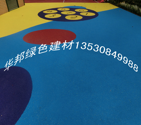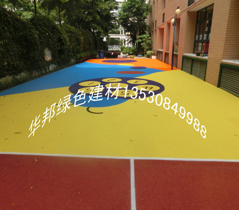 華邦綠色建材地板承建深圳寶安幼兒園室外圖案型EPDM橡膠地板鋪設工程,采用藍,黃,紅,灰顏色混搭色的DPDM橡膠地面,施工總面積980㎡,反映良好。(完工圖一覽)